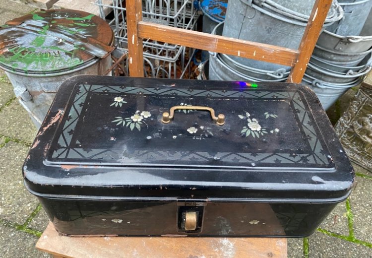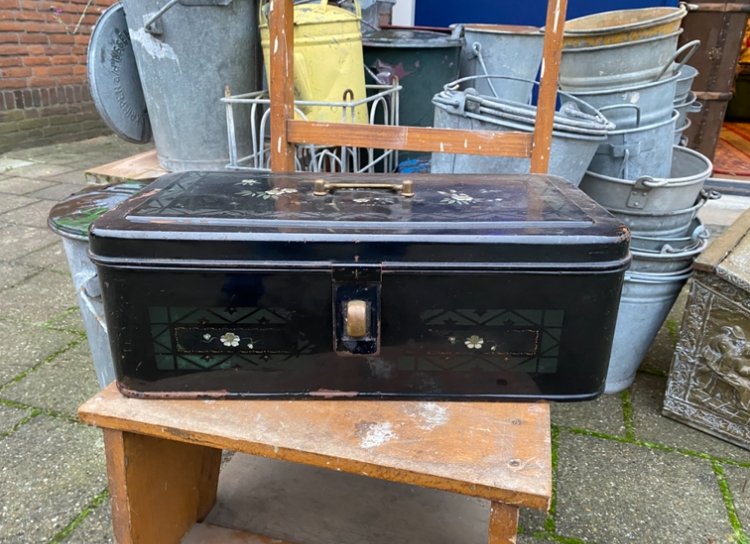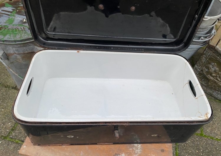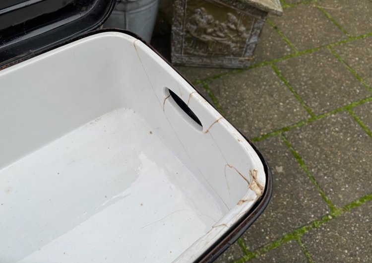 van 34,50 voor 27,50 zwart emaille broodtrommel met aardewerk binnen kant kom je echt zelden tegen