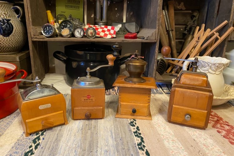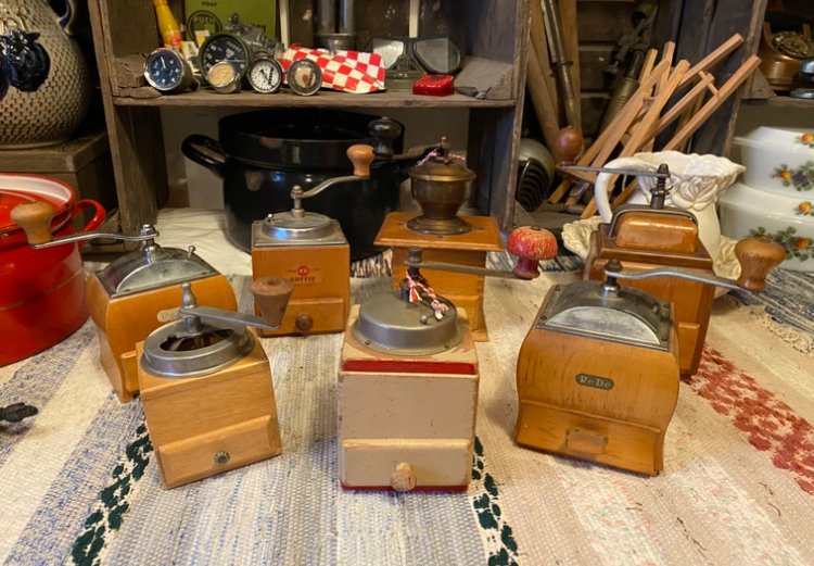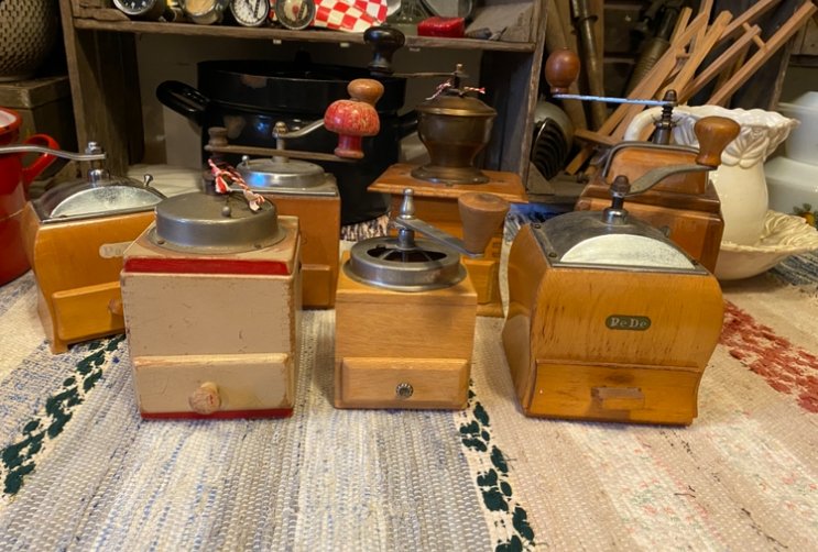 mooie verzameling van zeven vintage houten koffiemolens. ( in een koop )